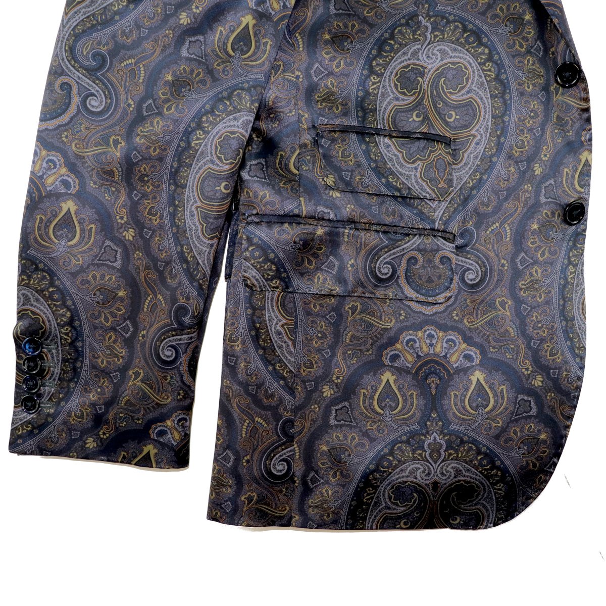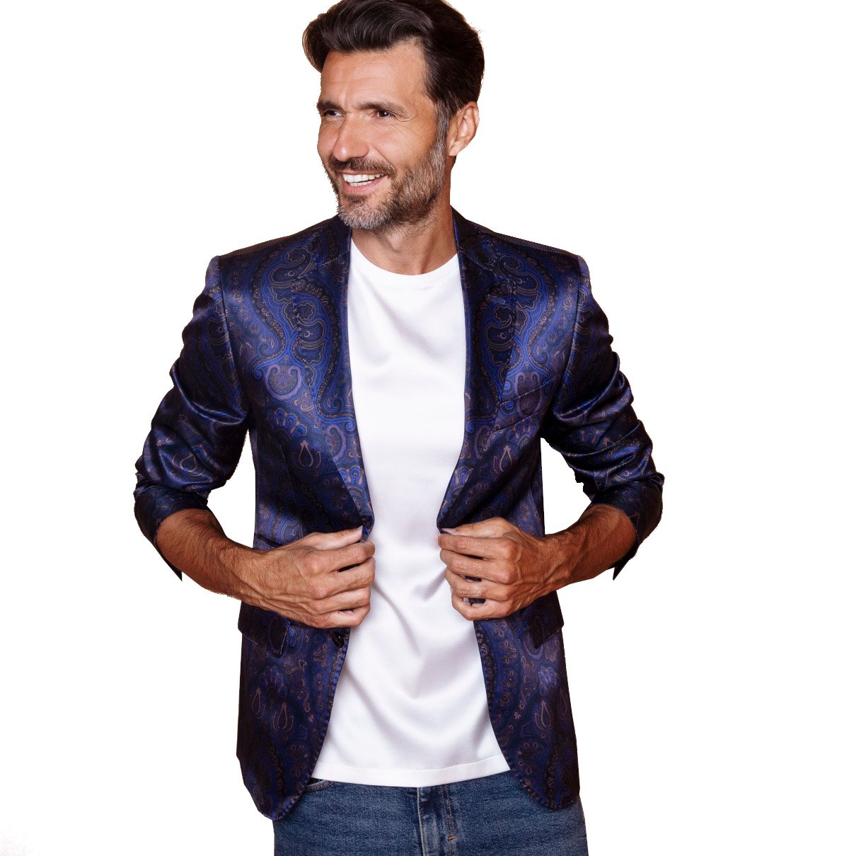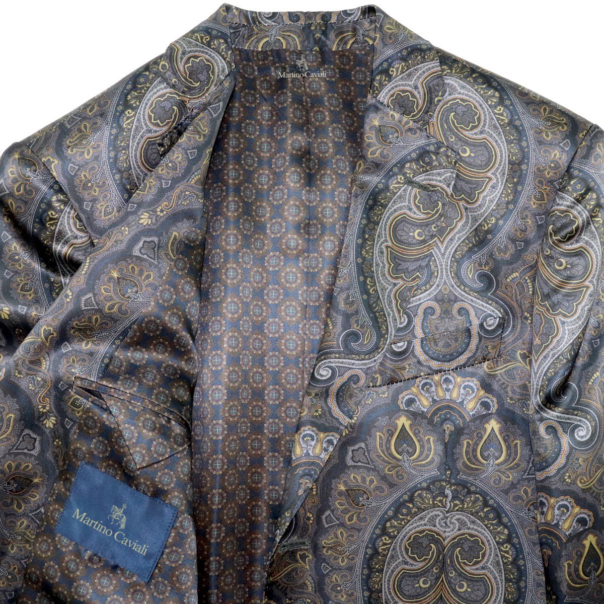 Elegante blazer da uomo con motivo paisley e fodera in seta a contrasto, rever a specchio, doppio spacco sul retro, cinque tasche. Fatto a mano in Italia.