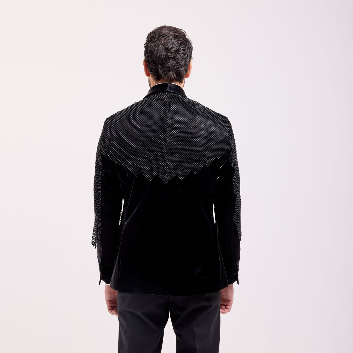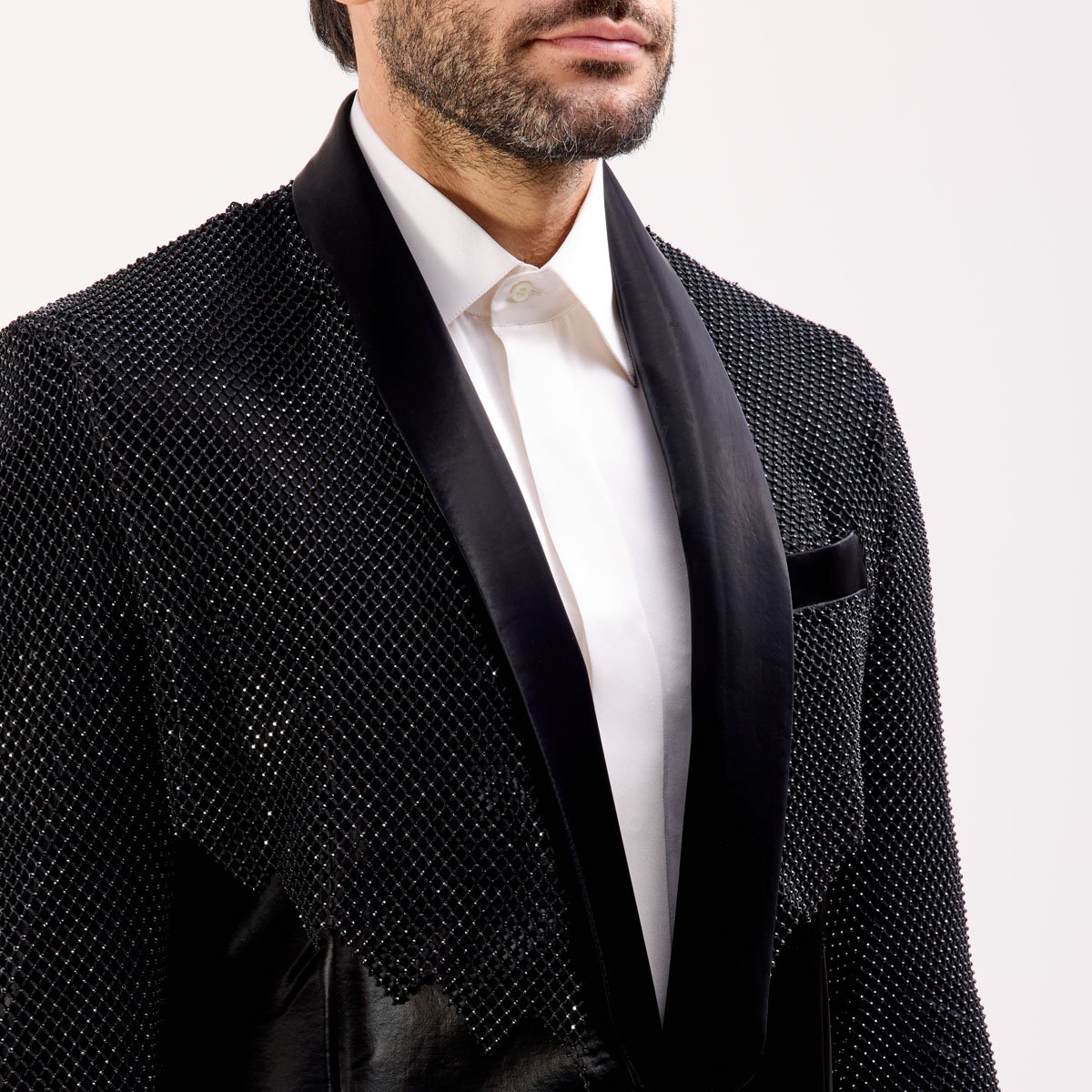 Giacca da smoking di lusso italiana da uomo con dettaglio in rete scintillante, vestibilità Drop 5, 100% Made in ItalyGiacca da smoking di lusso italiana da uomo con dettaglio in rete scintillante, vestibilità Drop 5, 100% Made in Italy